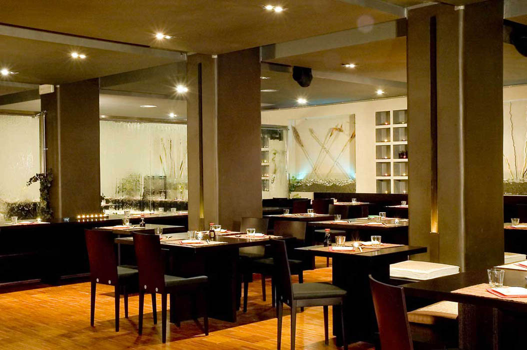 Le colonne portanti sono diventate gli elementi trainanti per la suddivisione degli spazi a pavimento e a soffitto della sala e sono state personalizzate da tagli nei quali si sono inseriti faretti colorati. I serramenti sono stati pannellati e sono diventati nicchie illuminate da faretti a colori cangianti a seconda dell'atmosfera della serata.