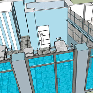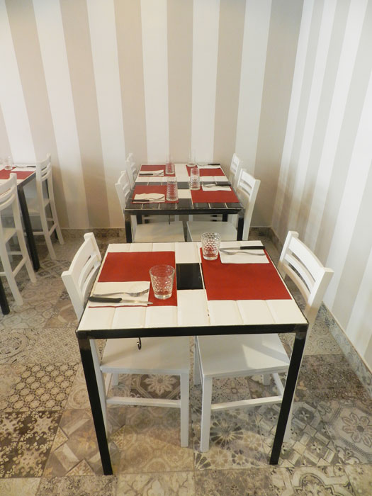 Una particolarità sono i tavoli dove il piano è fatto con piastrelle bianche e nere "assemblate" in modo differente uno dall'altro e le sedie sono tipiche sedie in legno da "osteria", così che l'insieme rende ancora più caldo e accogliente il locale. La zona cucina/forno è separata dalla zona pranzo da una grande vetrata in ferro e vetro che lascia vedere la preparazione della pizza e la cottura della stessa nel forno a legno rivestito in ferro.