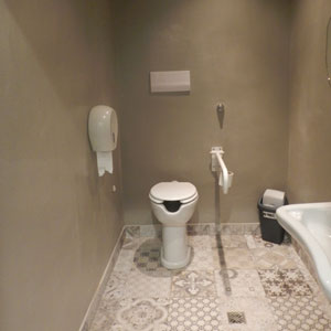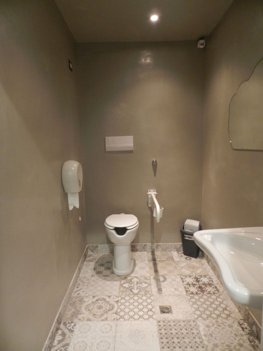 I corpi illuminanti riprendono i toni del locale, grigio, bianco, beige e nero e anche le piastrelle del pavimento sono tipiche "cementine" che ben completano l'idea del locale partenopeo. Infine di fronte all'ingresso una grande parete in lavagna con cornici di diverse misure e modelli accoglie il cliente con frasi tipiche napoletane e illustra i piatti del giorno.